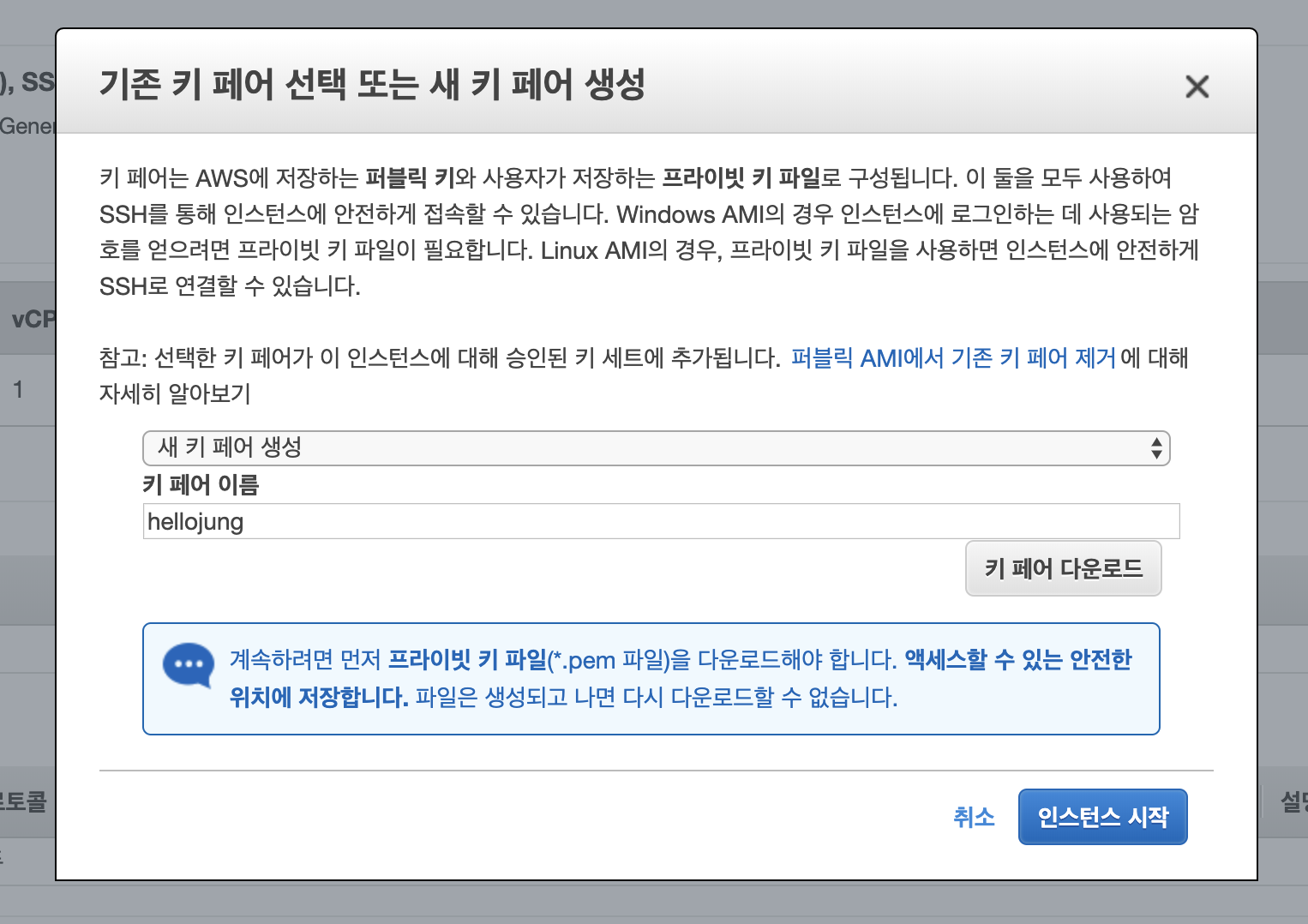 5. 키 페어에 대한 메시지가 나타나면 키 페어 생성하여 선택한다. (키 페어 없이 사용하는 옵션은 선택하지 말것!! 인스턴스 연결할 수 없음)