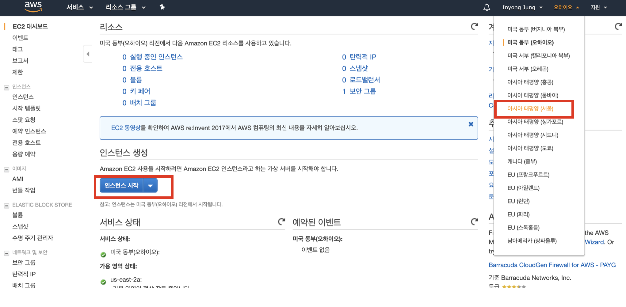 2. 콘솔의 우측 상단에 리전을 선택하고, '인스턴스 시작' 버튼을 누른다.