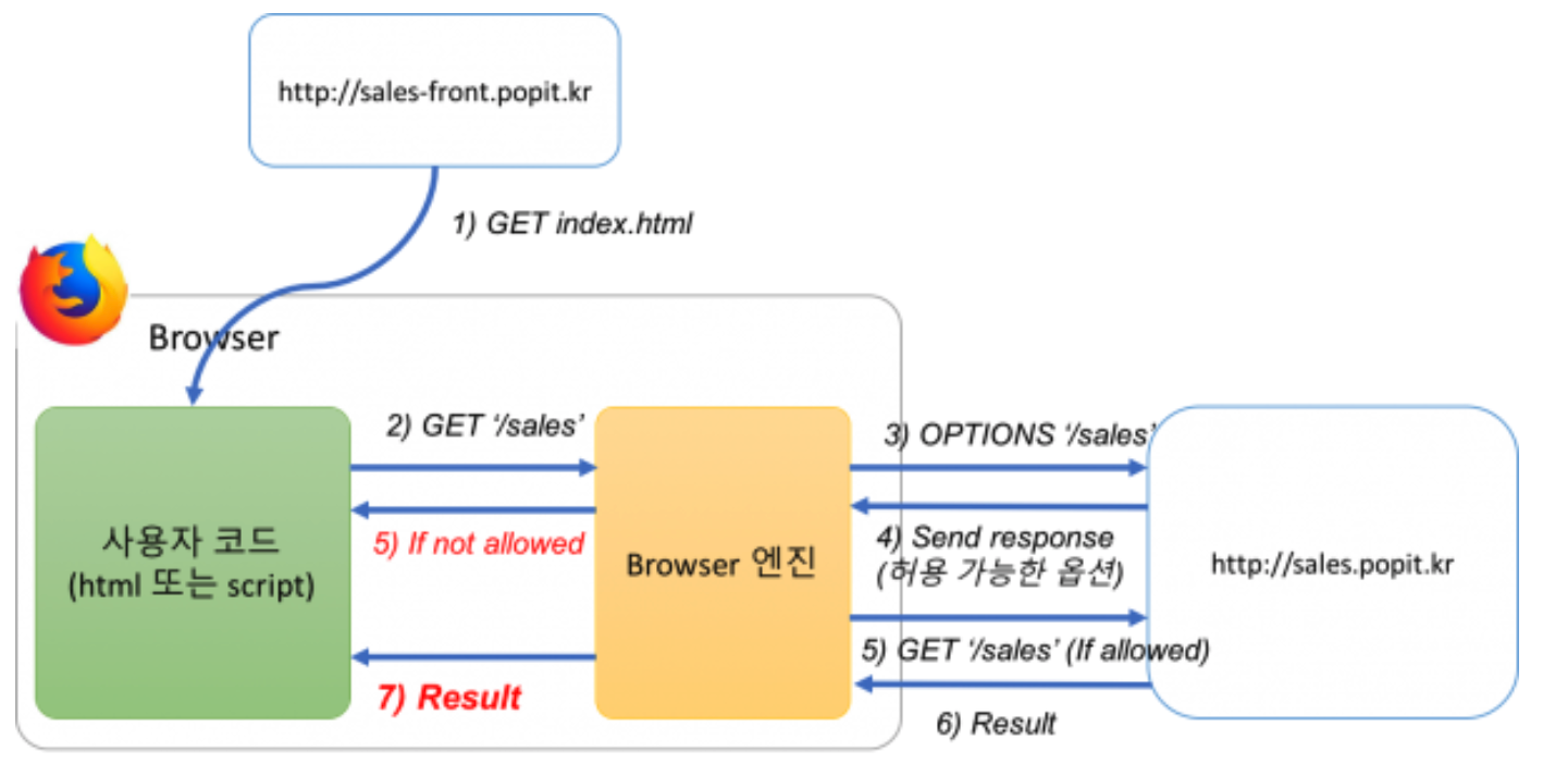 대부분의 브라우저는 이러한 CORS의 문제에 대해 준수하여 아래와 같은 표준화를 제시하고 있다.