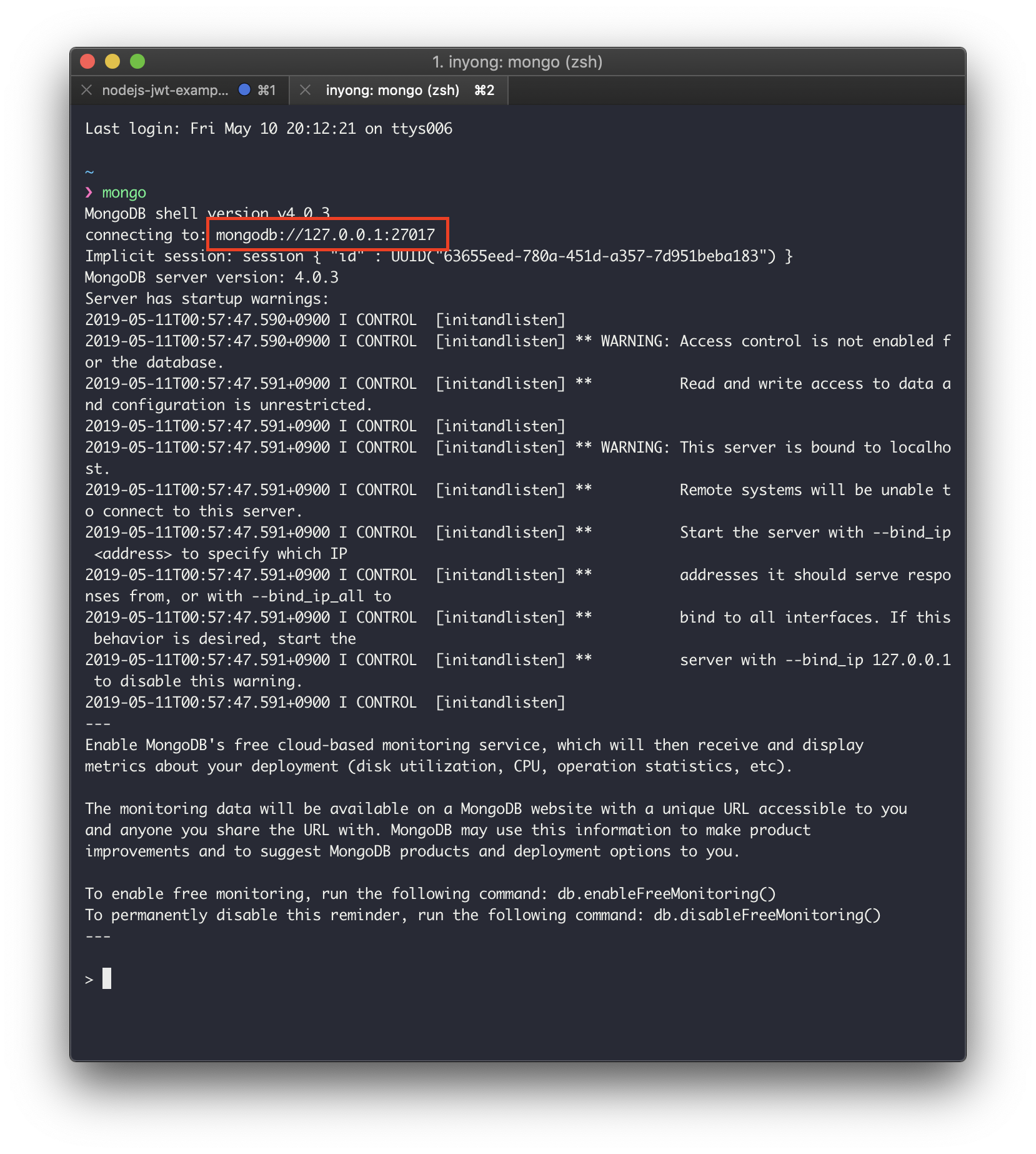 $ mongod이제 node 서버에서 mongoDB를 접속해보자. node 안에서 mongoDB를 접속하는 방법은 아래와 같다.