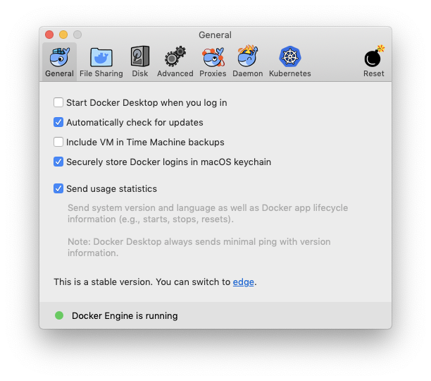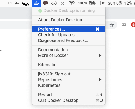 Preference를 클릭하면, 위처럼 Docker를 돌리는 데에 여러 가지 옵션을 설정할 수 있다.
