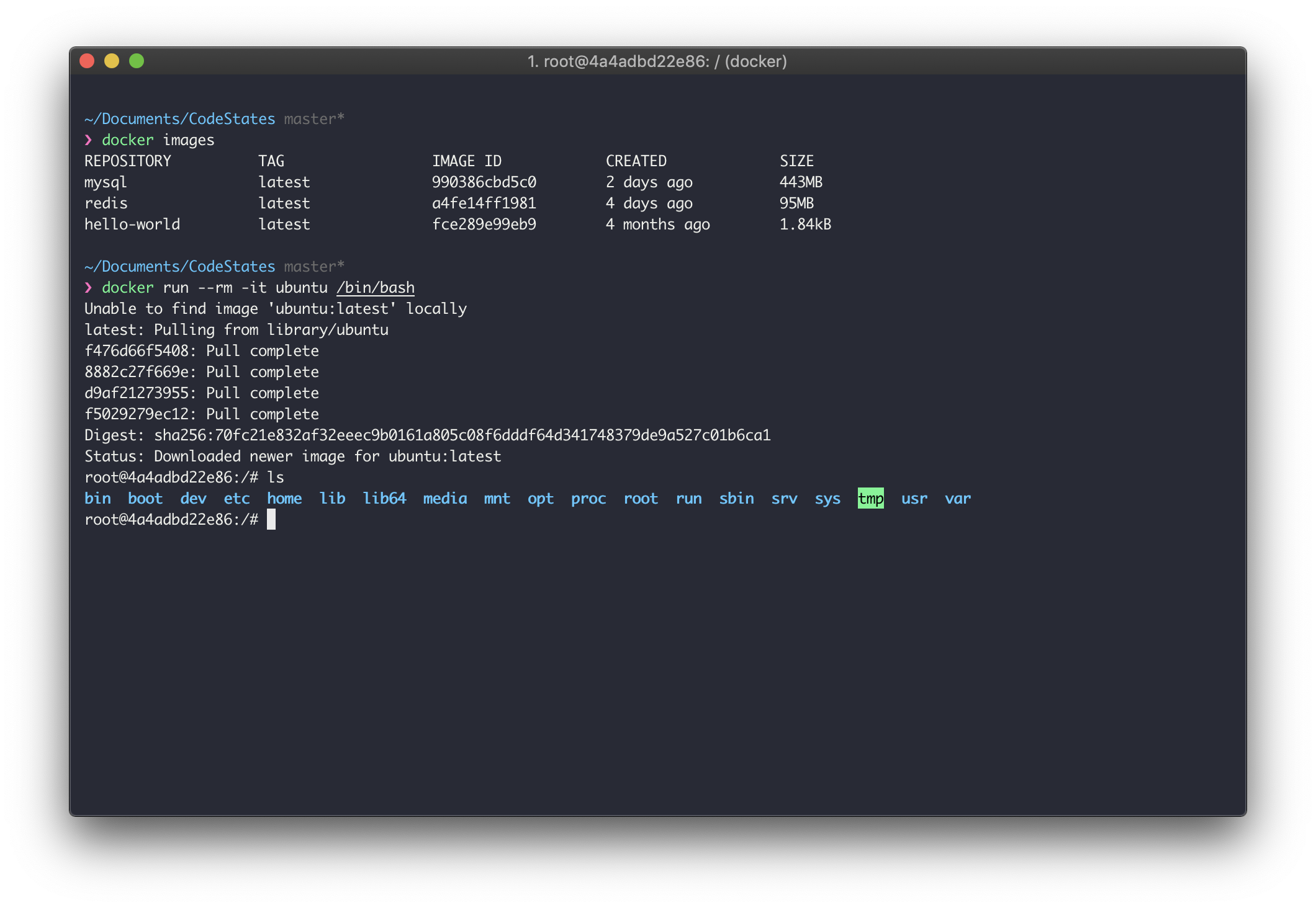 위처럼 ubuntu 이미지로 bash shell을 실행시키는 명령어를 입력하니, 해당 ubuntu이미지를 자동으로 다운로드하고(기존에 이미지가 존재하면 다운로드하지 않음) 실행되어, ubuntu 환경이 나타난 것을 확인할 수 있다.