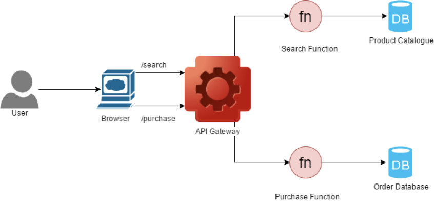 위 사진은 서버리스 아키텍처인데, 사진과 같이 각 함수들이 서버라는 요소에 종속되어 있지 않고 ,어딘가에 각 각 분산되어 있다. 이 분산되어 있는 함수를 사용하기 위해서는 APIGateway(중간에 빨간 톱니바퀴)가 제공해주는 각 함수의 엔드포인트를 제공받아 접근 및 호출을 할 수 있다.