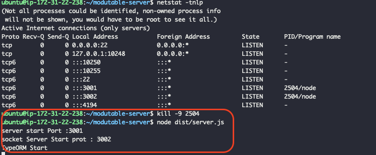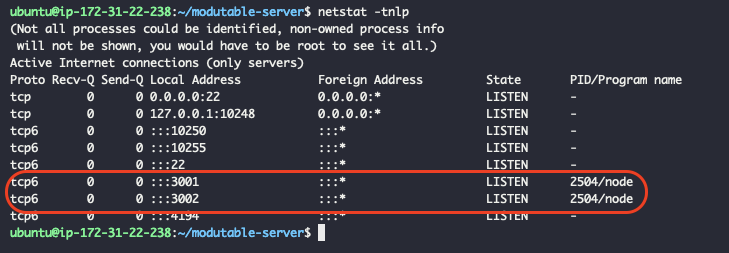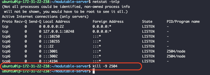 빨간색 표시한 부분을 보니, 3001,3002포트가 PID번호 2504로 node가 현재 사용되고 있는 것을 확인할 수 있다.
