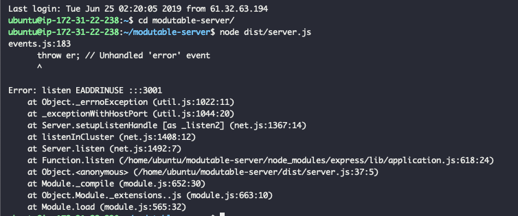 코드 에러사항 없고 문제없이 node로 서버를 돌릴려고 하는데, 아래와 같은 에러 메세지가 등장한다.