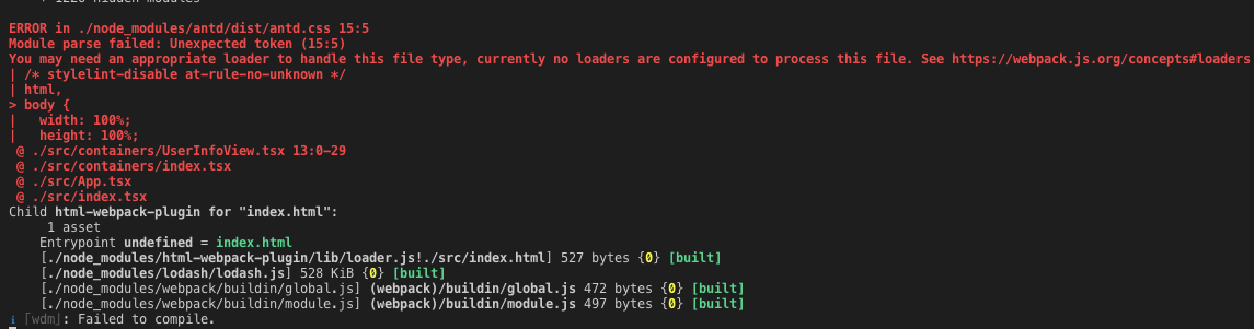 - 역시...module의 rules에 test쪽에 tsx 확장자 파일만을 작성했다...왠지 저 부분에 css파일을 적용시키지 않아, ant라이브러리의 css파일이 번들링 되지 않아서 일어난 오류같다..