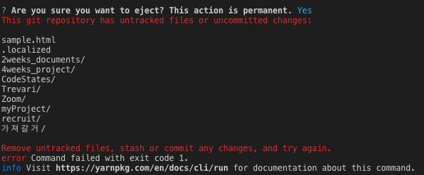 Y를 입력한 부분 바로 밑에 보면, 나는 git repository has untracked files or uncommitted changes 라는 에러 메세지가 떠 있다.