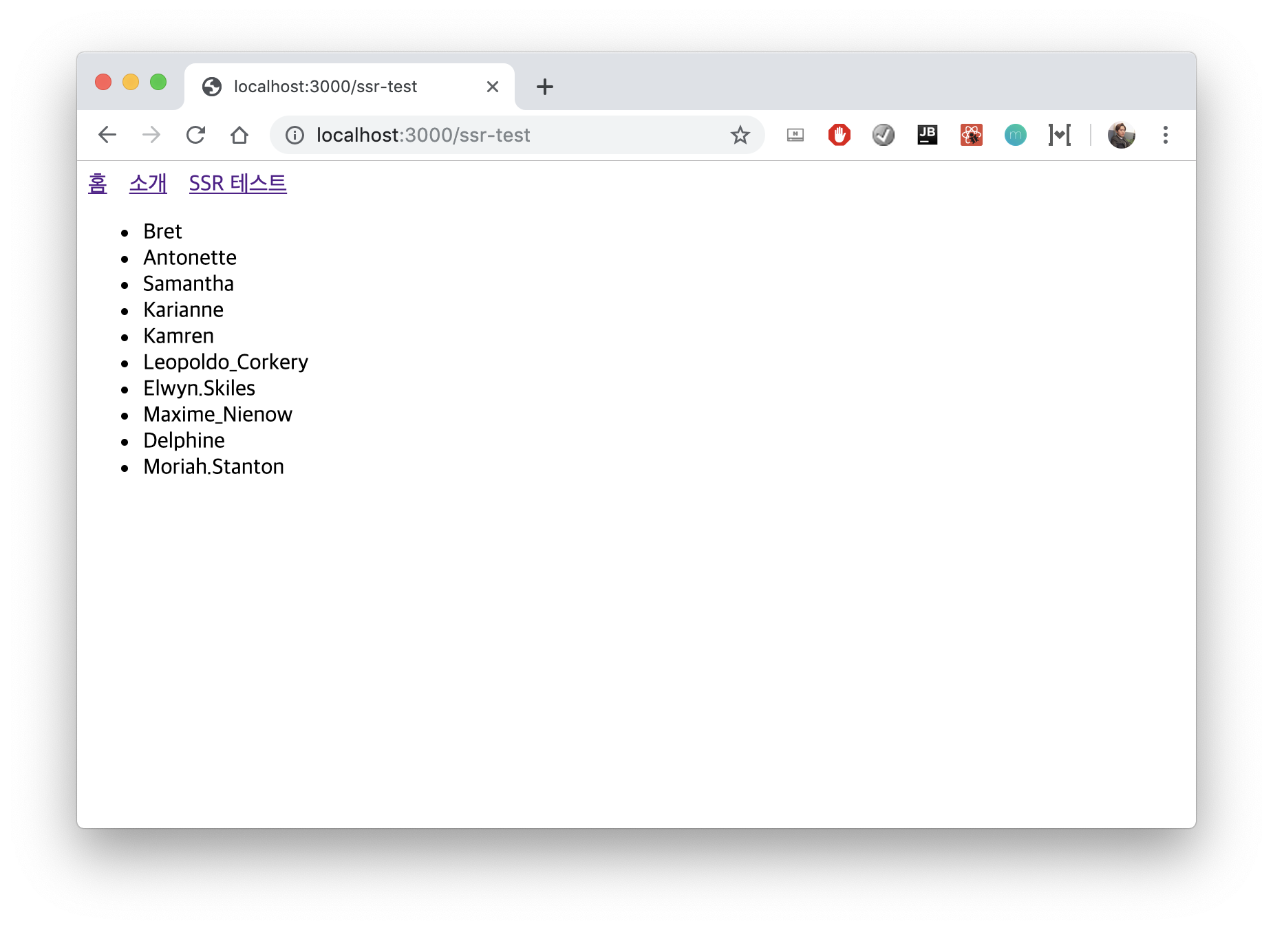 import Layout from '../components/Layout'; import Axios from 'axios'; class SSRTest extends React.Component { static async getInitialProps ({req}){ const response = await Axios.get('https://jsonplaceholder.typicode.com/users'); return { users: response.data } } render() { const {users} = this.props; const userList = users.map( user => <li key={user.id}>{user.username}</li> ) return ( <Layout> <ul> {userList} </ul> </Layout> ) } } export default SSRTest;결과 화면