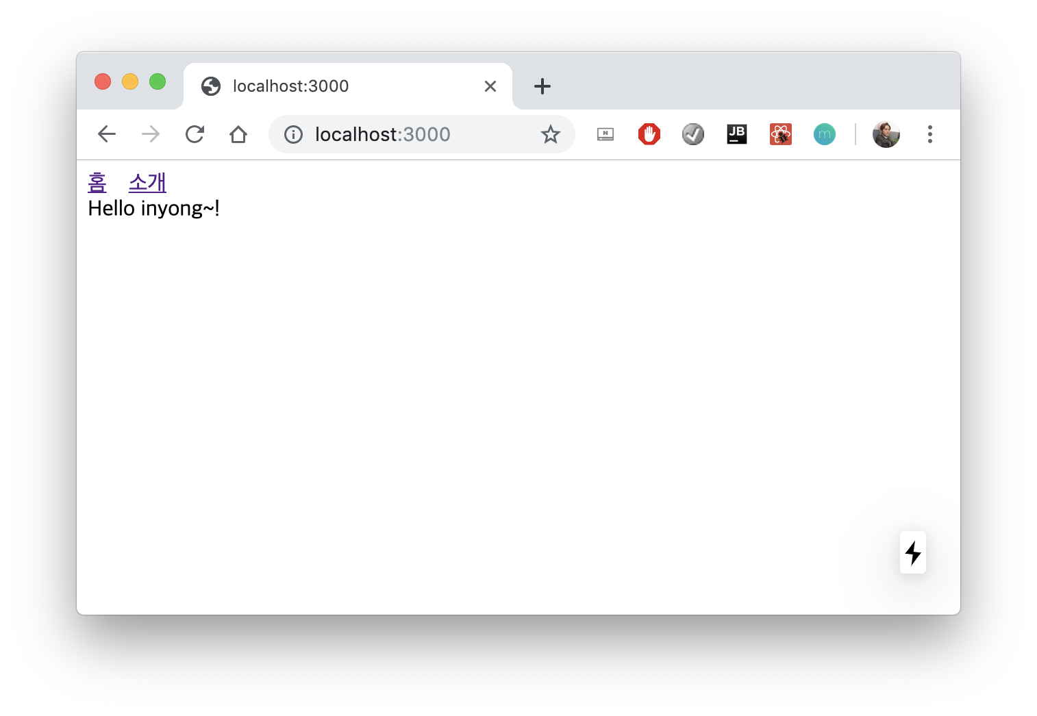 import Link from 'next/link'; const Index = () => { return ( <div> Hello inyong~! <Link href="/about"> <a>소개</a> </Link> </div> ) } export default Index;결과 화면