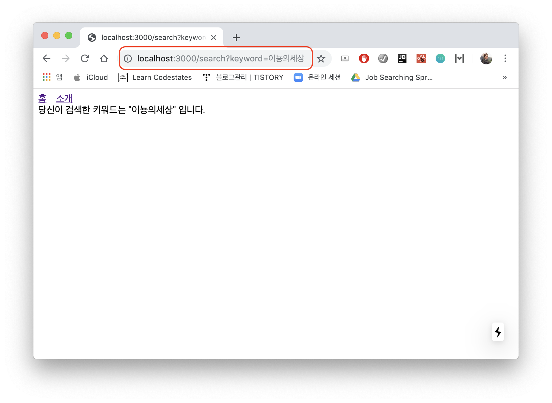 import Layout from '../components/Layout'; const Search = ({url}) => ( <Layout> 당신이 검색한 키워드는 "{url.query.keyword}" 입니다. </Layout> ) export default Search;그리고 주소창으로 직접 쿼리 파라미터를 날려본다~!