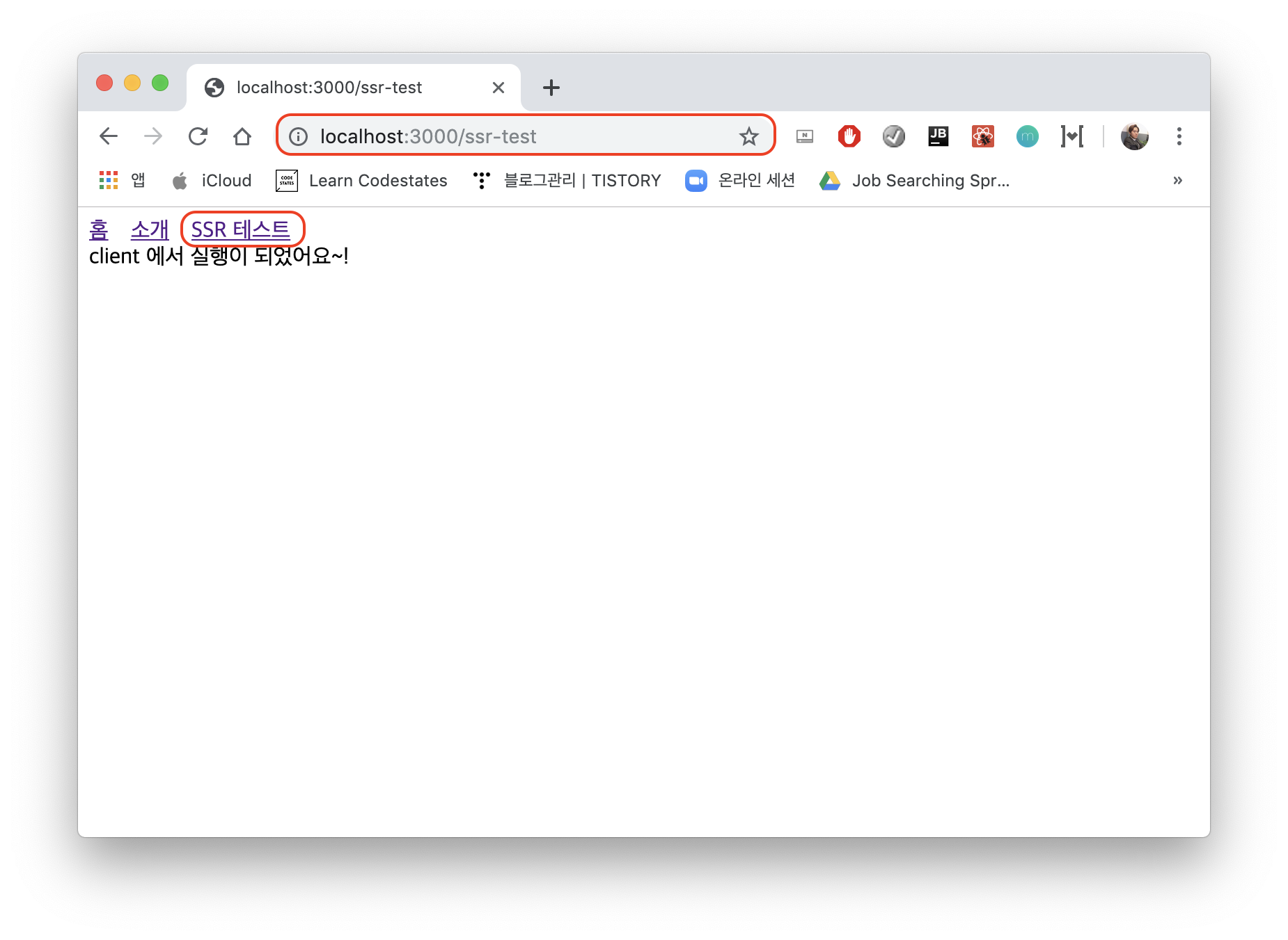 import Link from 'next/Link'; const linkStyle = { marginRight: '1rem' } const Header = () => { return ( <div> <Link href="/"><a style={linkStyle}>홈</a></Link> <Link href="/about"><a style={linkStyle}>소개</a></Link> <Link href="/ssr-test"><a style={linkStyle}>SSR 테스트</a></Link> </div> ) } export default Header;ssr-test.js 파일을 실행시킬 수 있도록, 공용 컴포넌트인 Header 파일에 Link를 하나 더 추가해준다.