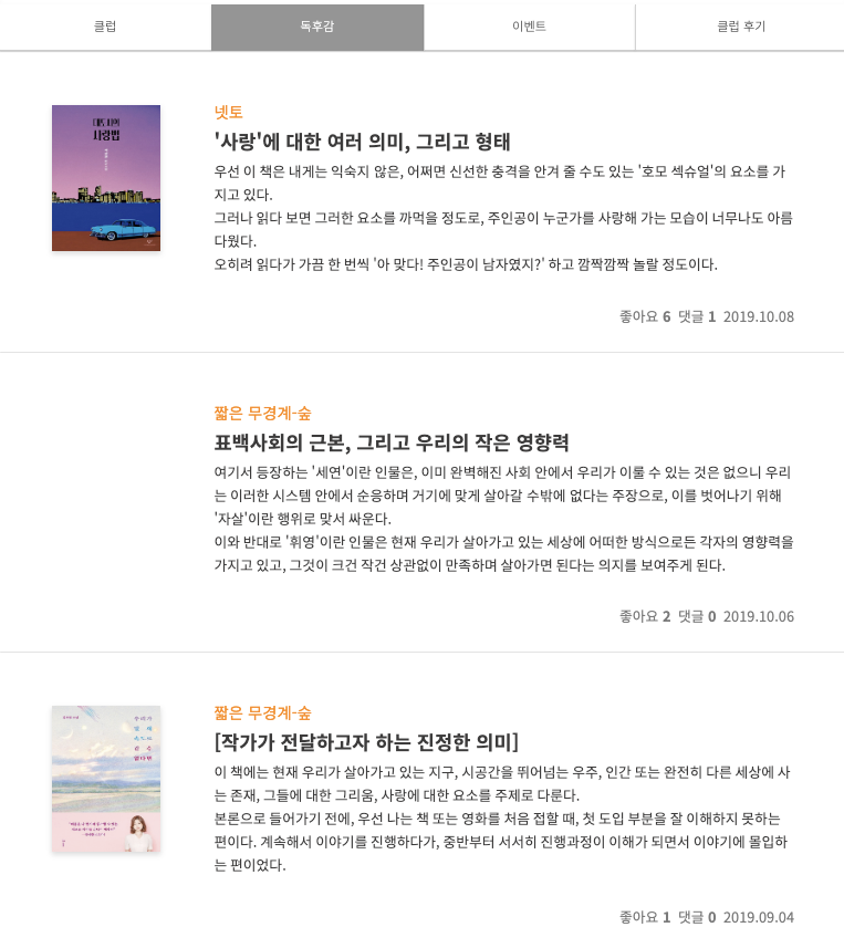 기존에 마이페이지 화면 안에, 클럽, 입금 대기 이벤트, 찜한 클럽 내용들을 탭 형식으로 전부 나뉘어서 보여주던 것을, 결제내역 페이지, 찜 리스트 페이지를 생성하여 분리하고, 마이페이지 화면에서는 클럽, 이벤트, 독후감만 보여주도록 변경했다.