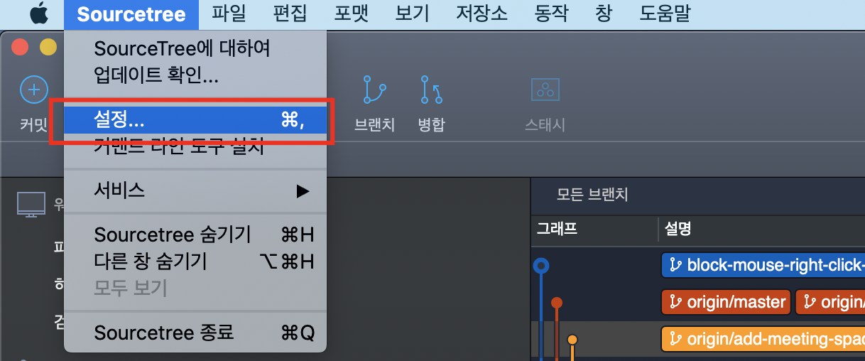 소스트리 창이 켜진 상태에서, 소스트리의 '설정'을 클릭한다.