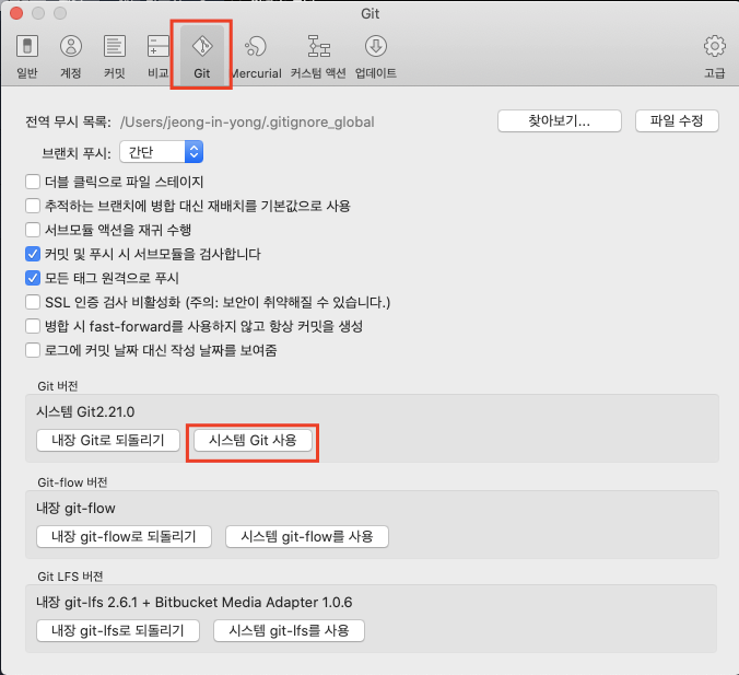 설정 창에서 'git' 탭 클릭 후, '시스템 Git 사용'을 클릭한다.
