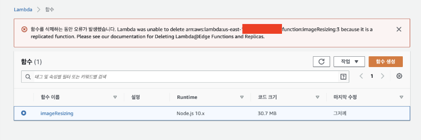 콘솔에서 함수를 삭제하려 하는데, 해당 메시지와 같이 삭제가 되지 않는 이유는 이미 CloudFront에 배포되어 대기 상태에 있기 때문이다.