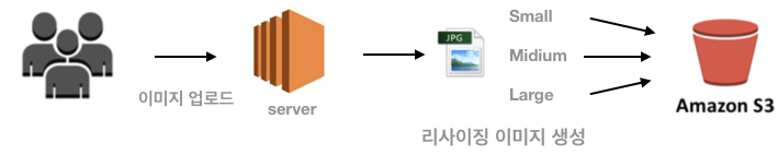 이미지를 업로드 시, 서버에서 원본 이미지를 여러 사이즈의 이미지 파일로 리사이징하여 각 파일을 생성 후 S3 버킷에 모두 저장한다.