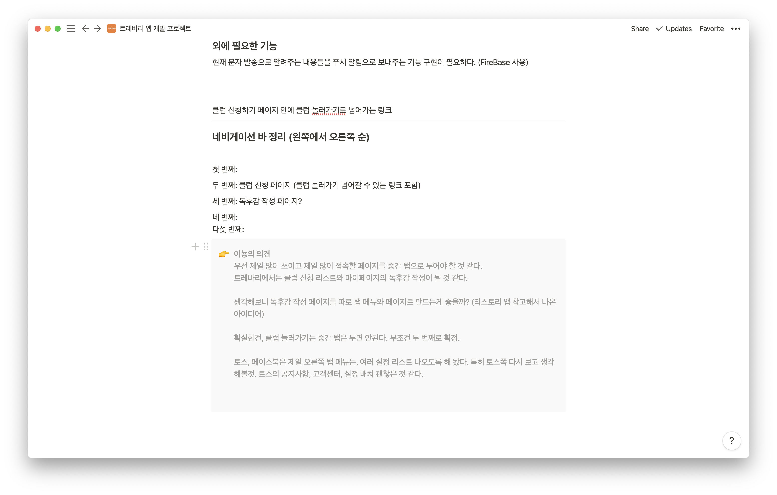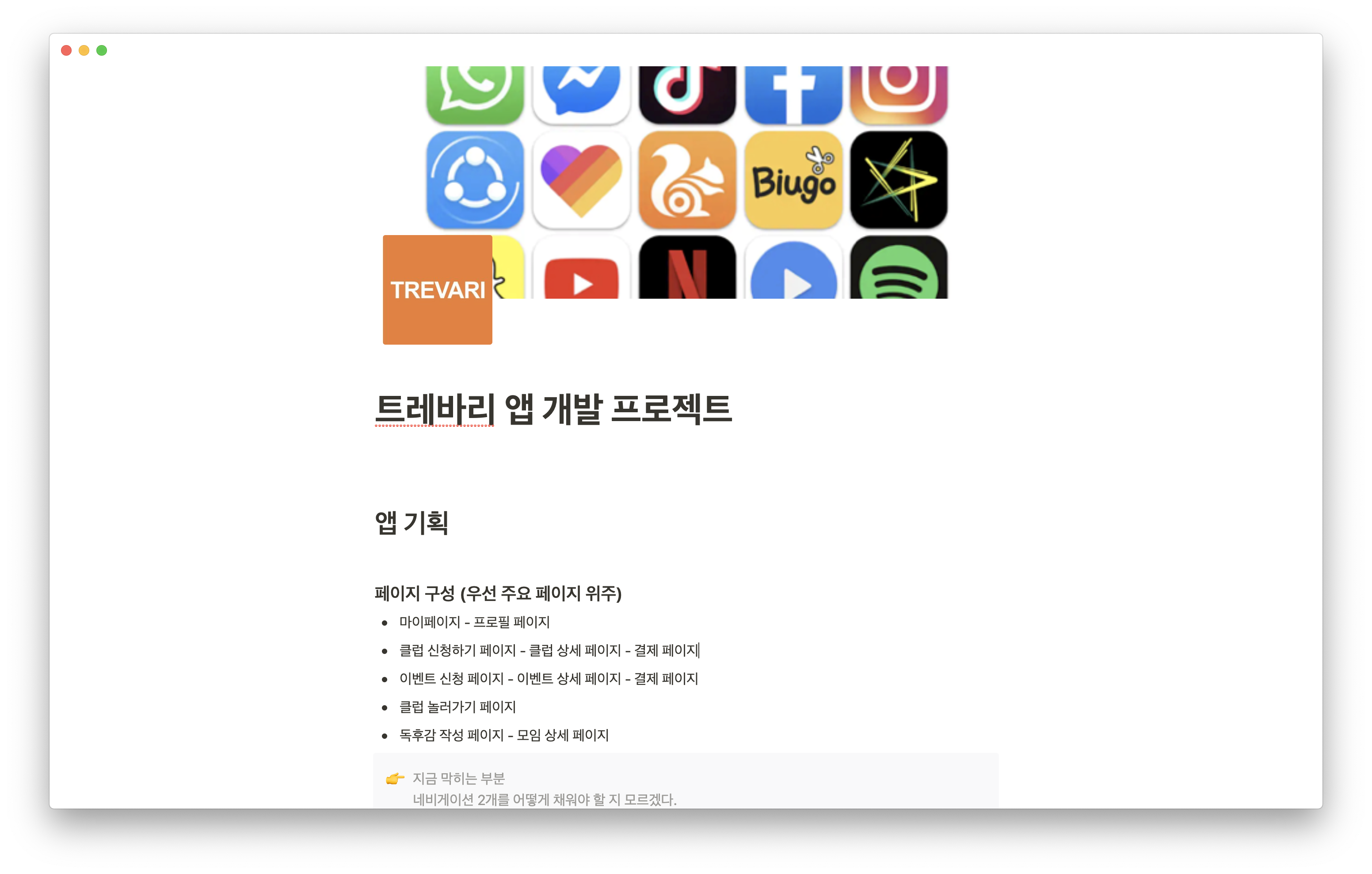 이뇽의 트레바리 앱 개발 프로젝트 기획 노션 문서 처음 기획부터 너무 막막하다..-.-
