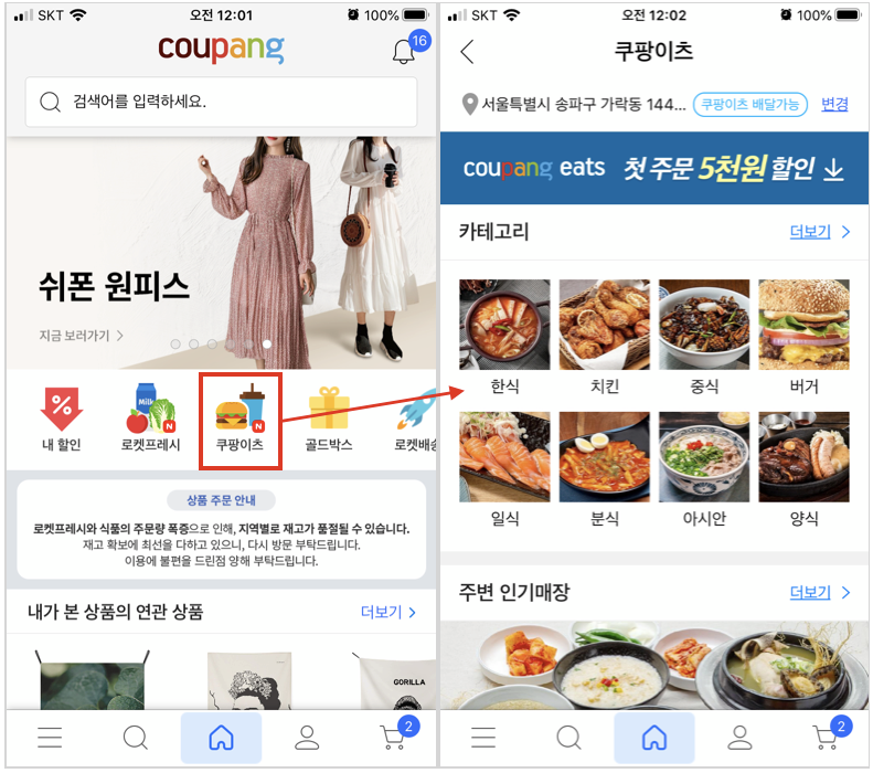 하단 바의 중간 탭 페이지인데, '쿠팡이츠'를 클릭하면 배달 음식 관련하여 새로운 리스트 페이지가 등장한다.