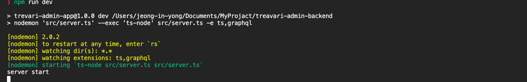 "scripts": { "dev": "nodemon 'src/server.ts' --exec 'ts-node' src/server.ts -e ts,graphql" }터미널에서 npm run dev 명령어를 실행하면, nodemon이 동작하면서 console.log의 값이 찍힐 것이다. nodemon은 server.ts 파일의 코드가 변경될 때마다 다시 컴파일 할 것이다.