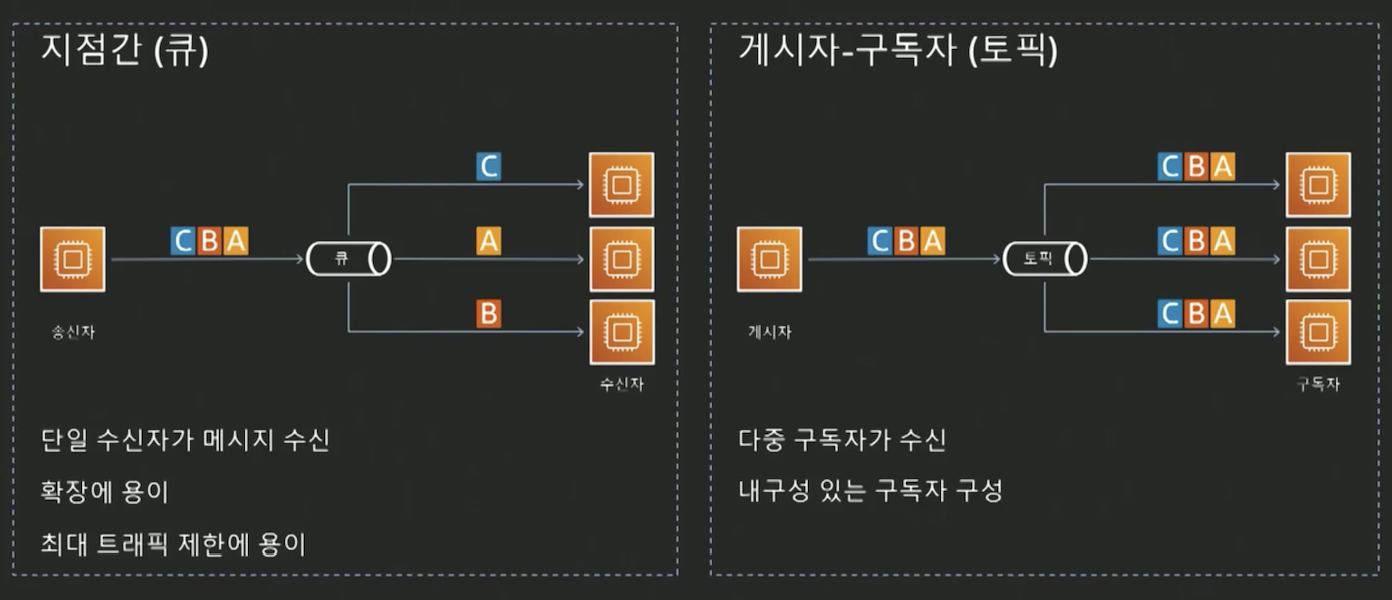 AWS Summit 이벤트 드리븐 아키텍처 발표 자료 중 왼쪽의 큐는 다수의 수신자에게 과부하로 인해 누락 없이 정확하게 메시지를 보내기 위한 아키텍처 방식.