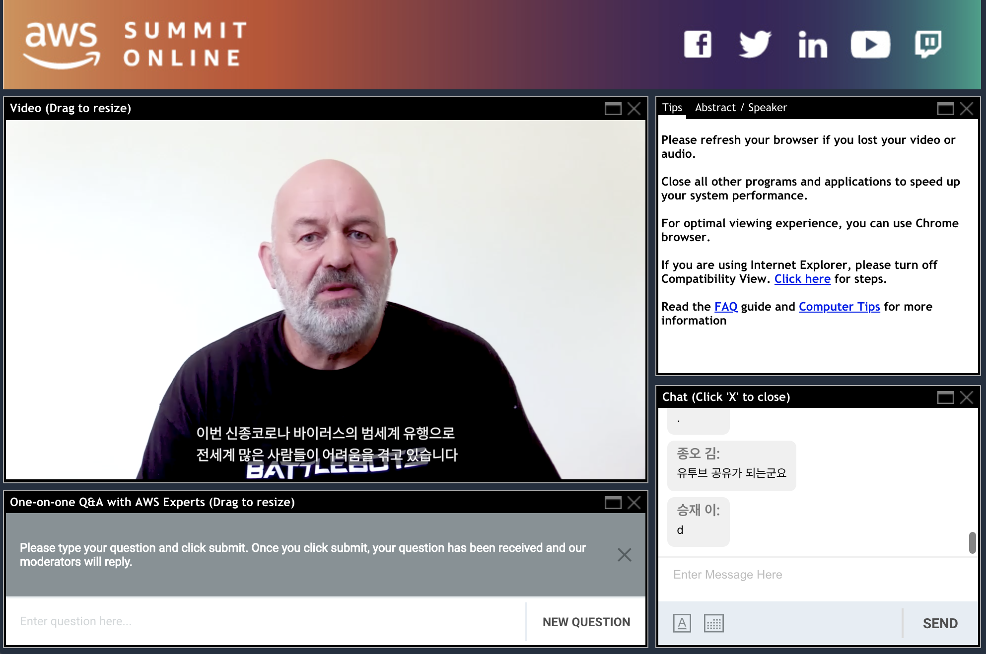 개막 영상을 포함해서, 모든 세션 영상은 라이브가 아닌 녹화본으로 진행되고, 궁금한 점은 채팅이나 FAQ 창에 따로 작성을 하면, 전문가가 실시간 답변을 해주는 방식으로 진행이 되었다.