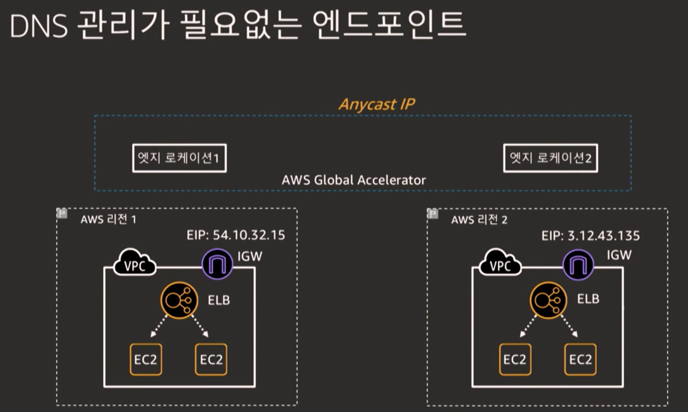 고정된 IP로 엔드포인트를 제공한다. 다중 리전 구성에서 최적의 리전으로 연결을 한다.