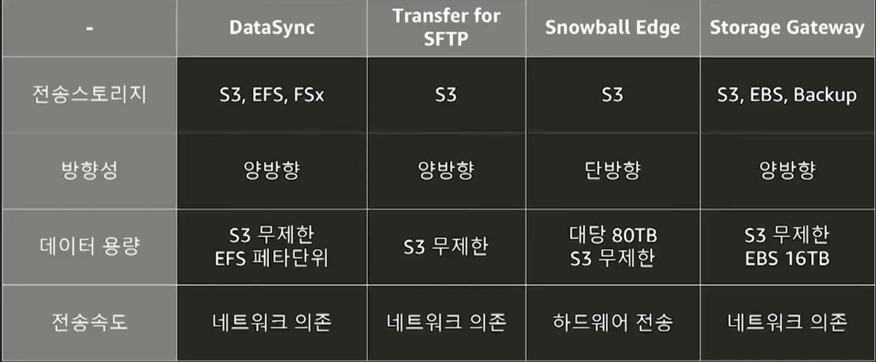 AWS Snowball Edge : 물리적 저장장치. 최대 100TB 스토리지 용량. 여기에 저장 후 AWS로 전달하면 AWS에서 S3로 업로드.