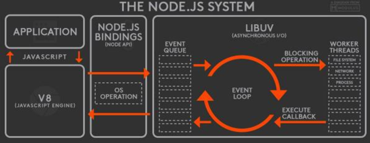 Node.js는 비동기 IO를 지원하기 위해 libUV 라이브러리를 사용하며, 여기서 이벤트 루프가 제공된다. 자바스크립트 엔진은 비동기 작업을 위해 Node.js의 API를 호출하며, 이때 넘겨진 콜백은 libUV의 이벤트 루프를 통해 처리되는 것이다.