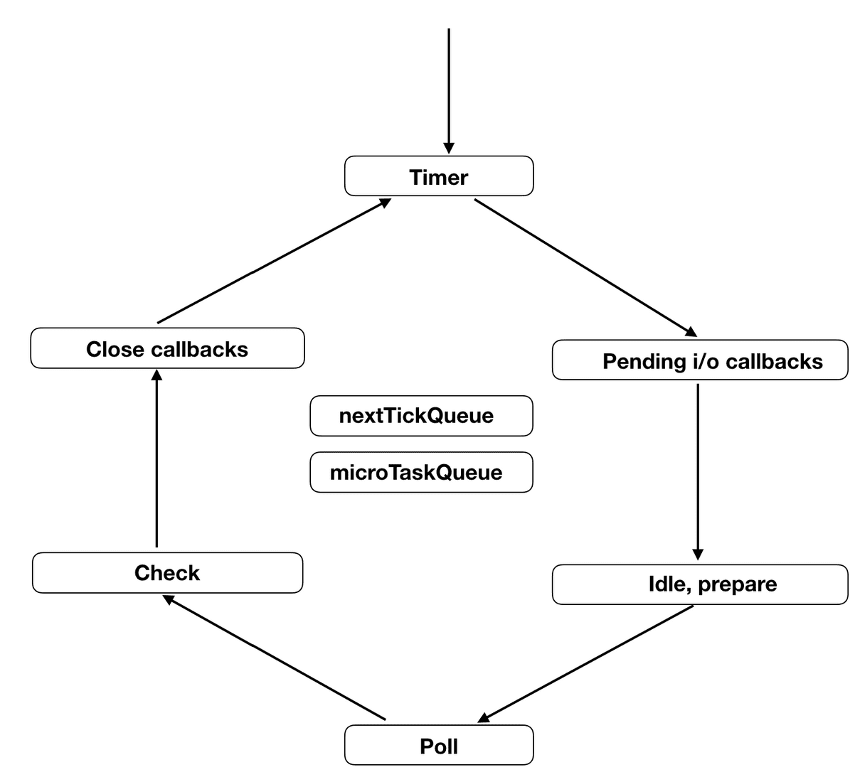 이 두 개의 큐에 들어있는 콜백들은 어떤 페이즈에서든 실행될 수 있다. 페이즈에서 다음 페이즈로 넘어가기 전에 자신이 가지고 있는 콜백들을 최대한 빨리 실행해야 하는 역할을 맡고 있기 때문이다. 또한 nextTickQueue는 microTaskQueue보다는 높은 우선순위를 가지고 있다.nextTickQueue는 process.nextTick() API 콜백들을 가지고 있고, microTaskQueue는 Resolve 된 프로미스의 콜백을 가지고 있다.