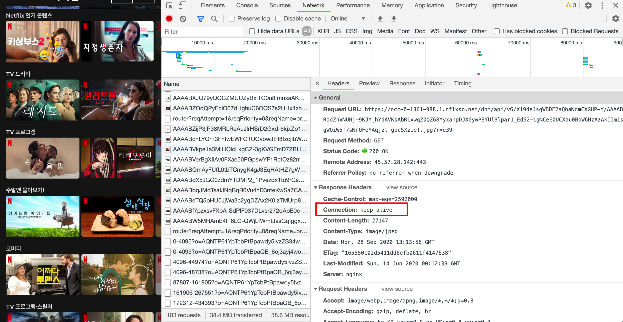 Connections 헤더를 보면 keep-alive로 나와있는 것을 알 수 있다. 이것은 HTTP 1.1에서 네트워크 통신 성능 향상을 위해 추가된 기능이다.