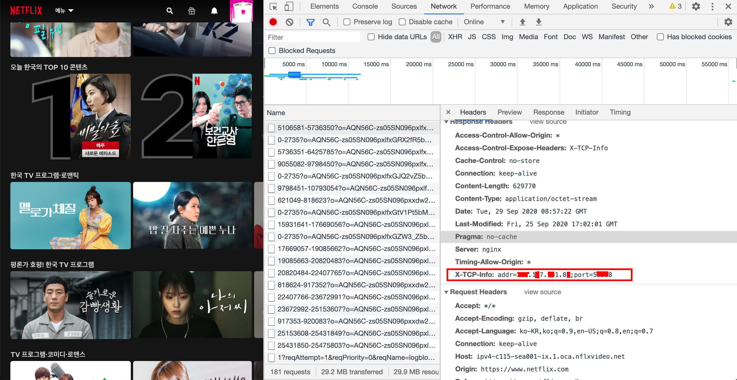 출처 : https://www.geekzone.co.nz/forums.asp?forumid=151&topicid=146618&page_no=28 아하..! 넷플릭스는 CDN 서버를 사용하고 있었고, TCP-Info의 사용자 IP가 헤더에 추가되어 응답하는 것이 제대로 캐시가 적중되고 있다는 증거였군...(어쩐지.. CDN을 사용하지 않을 리가 없다고 생각했다..)