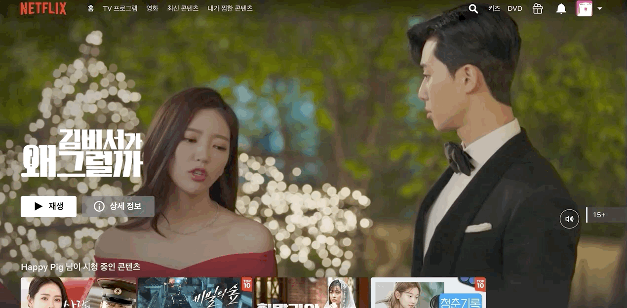 넷플릭스에서는 제일 상단의 메인 배너 혹은, 각 섬네일에 마우스를 갖다 대면 위처럼 해당 작품의 일부 장면이 영상으로 보이게 된다.