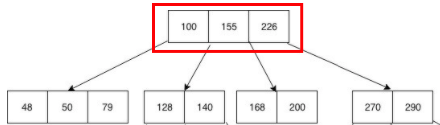 1. 200이라는 값이 있는지 확인하기 위해, 100, 155, 226이 저장되어 있는 Root 노드에 있는 데이터들을 탐색한다. 실제 메모리 디스크 상 순차적으로 저장되어 있는 데이터들을 빠르게 탐색한다.
