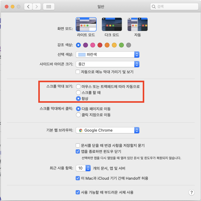 맥북 환경설정의 '일반'에서 스크롤 막대 보기에서 내 로컬 환경에서 View가 길면 스크롤 막대를 어떻게 보여줄지 선택할 수 있는 설정 기능이 있다.