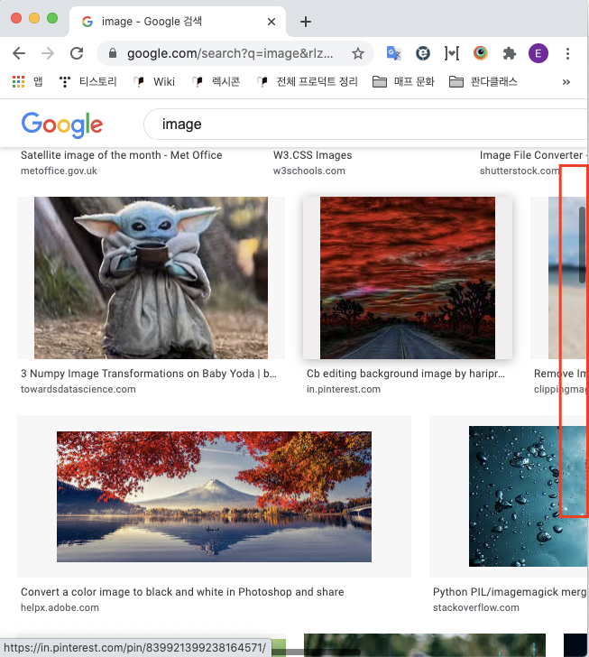 '마우스 또는 트랙패드에 따라 자동으로' 혹은 '스크롤 할 때'를 선택하면 위 이미지처럼 기존의 페이지 상태를 유지한 채, 플로팅 방식으로 스크롤 막대가 살짝 비춰지는 방식으로 보여진다.