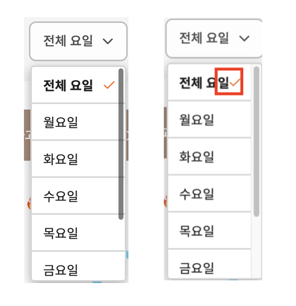 커스텀 option 내의 주황색 체크 표시가 right 기준으로 배치를 해놨는데, 스크롤 바가 오른쪽에 공간을 차지하면서 왼쪽으로 밀려버려서 디자인이 이상해진 것이다.