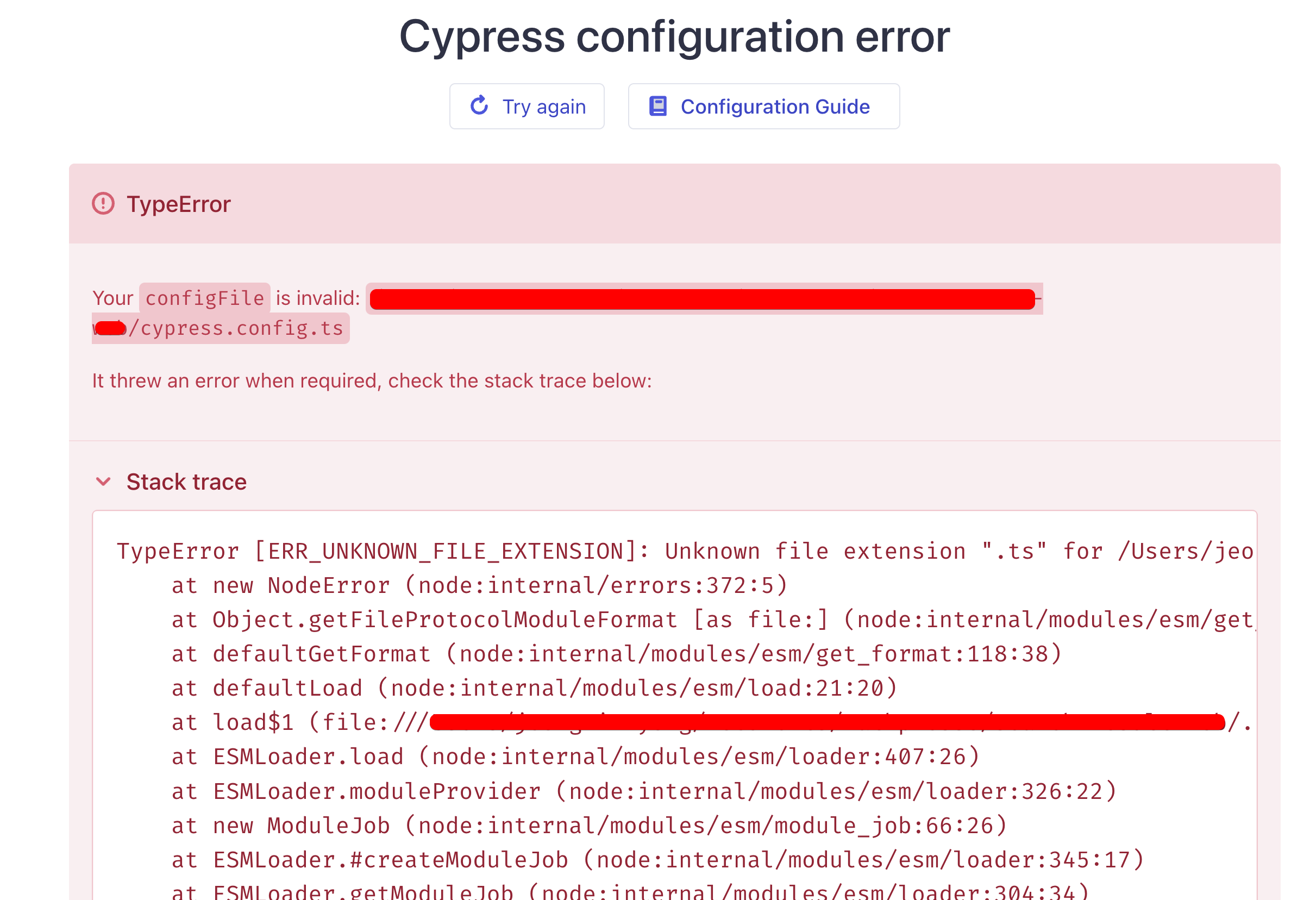 cjs로더로 동작하도록 하기 위해 기존에 cypress.config.ts 파일을 cypress.config.js 파일로 변환 후 실행하니 Cypress 자체 실행은 정상적으로 되는 것을 확인할 수 있었다.