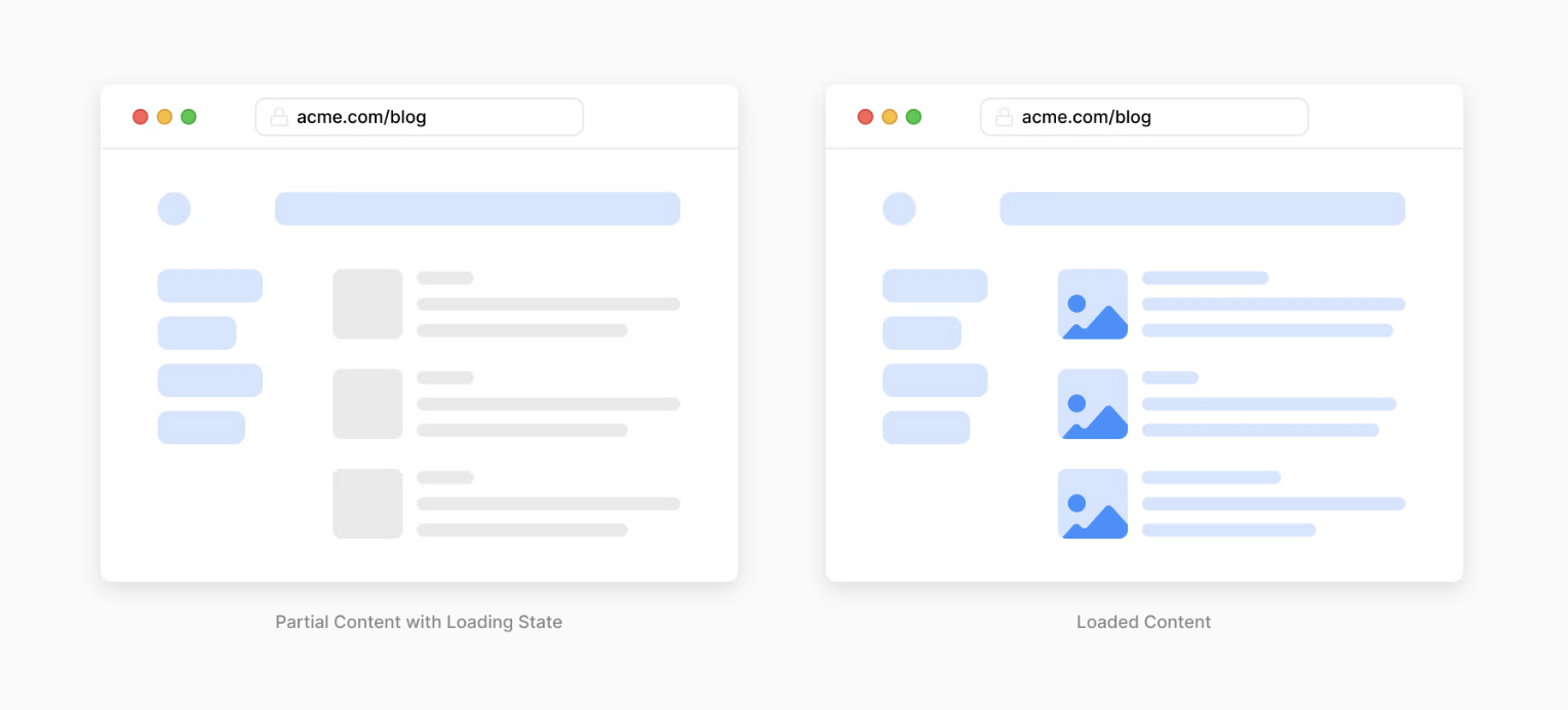 이것도 app/ 디렉토리 내에서 이루어지는 기능인데, 서버 사이드 단에서 컴포넌트를 점진적으로 렌더링 한 뒤 스트리밍 방식으로 클라이언트에게 전달하는 방식이다.