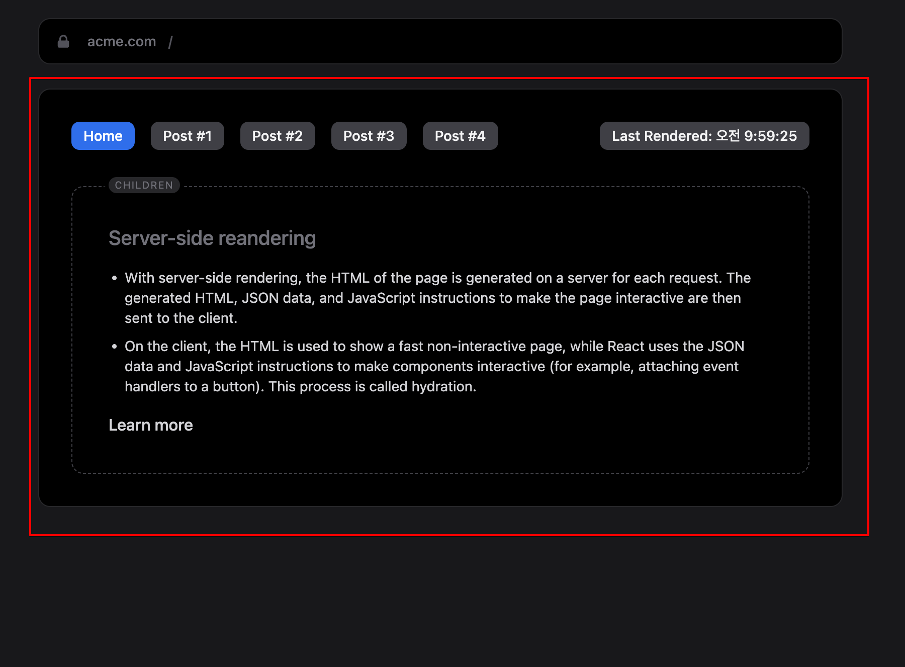 import { ReactNode } from 'react'; import DataNav from './DataNav'; export default function Layout({ children }: { children: ReactNode }) { const ids = [{ id: '1' }, { id: '2' }, { id: '3' }, { id: '4' }]; if (!ids) return null; return ( <div className="space-y-9"> <div className="flex items-center justify-between"> <DataNav ids={ids} /> <div className="rounded-lg bg-zinc-700 px-3 py-1 text-sm font-medium tabular-nums text-zinc-100"> Last Rendered: {new Date().toLocaleTimeString()} </div> </div> <div>{children}</div> // <- 여기가 실제 컨텐츠 </div> ); }전체적인 컨텐츠 영역은 {children}를 통해서 배치하며, 동일한 라우팅 경로 내에서 일어나는 컴포넌트 변경 부분은 컴포넌트가 바뀌어도 최대한 렌더링이 일어나지 않고 유지되는 식이다.