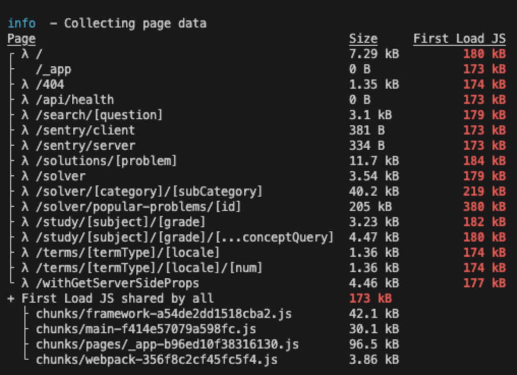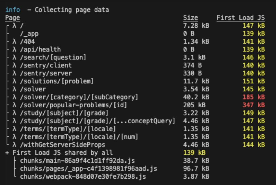 module.exports = { ... webpack: (config, { webpack }) => { Object.assign(config.resolve.alias, { react: 'preact/compat', 'react-dom': 'preact/compat', 'react/jsx-runtime.js': 'preact/compat/jsx-runtime', 'react-dom/test-utils': 'preact/test-utils', }); return config; } }Preact로 변경 후, 번들 사이즈 비교