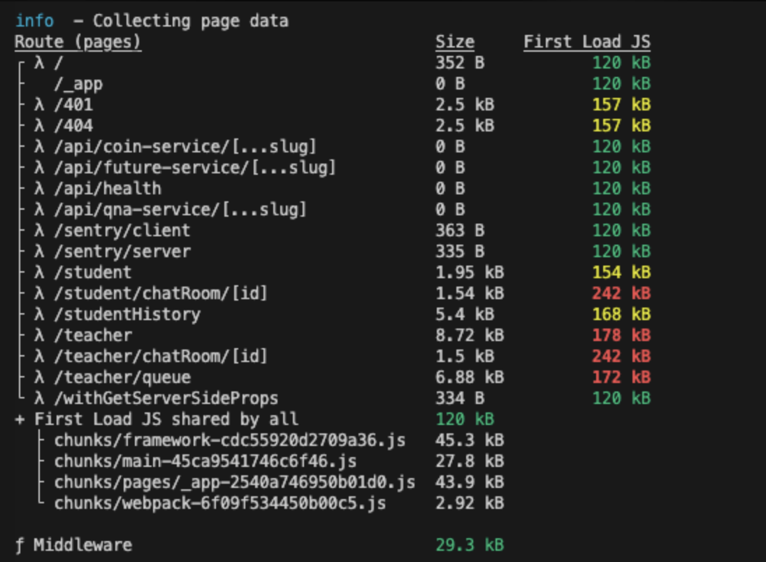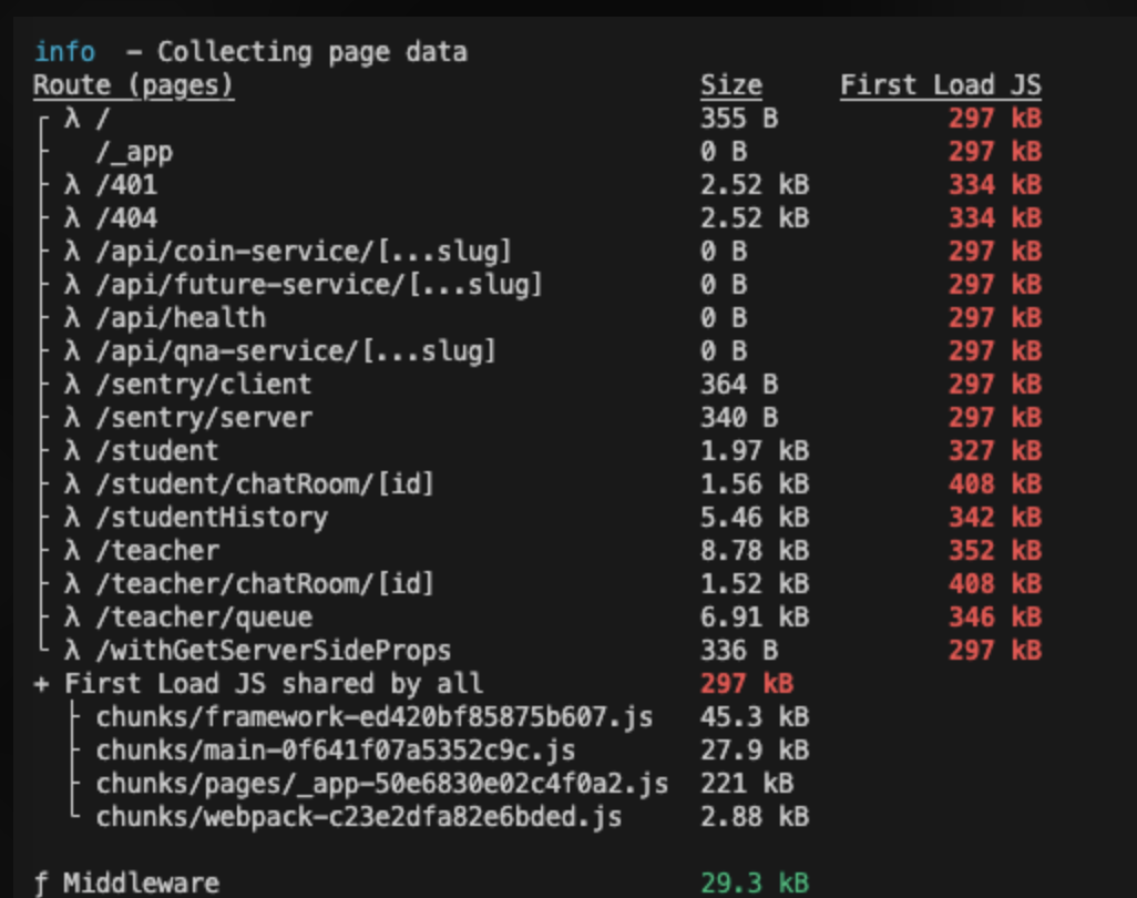 가장 상단의 컴포넌트를 주석 처리를 하고 빌드를 해보니 First Load Bundle Size가 약 10kb 정도 줄어들긴 했지만, 여전히 300kb나 되는 굉장히 큰 것을 보고 이것이 큰 원인은 아니라는 것을 깨달았다.