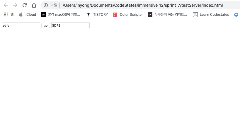 <!DOCTYPE html> <html lang="en"> <head> <meta charset="UTF-8"> <title>Document</title> </head> <body> <input type="text" id='inputText' /> <input type="button" id="btn" value="go" onclick="test()" /> <input type="text" id='resultText' /> <script> function test(){ var input = document.getElementById('inputText').value; fetch('http://localhost:3000/upper',{ method: 'POST', body: JSON.stringify(input), headers: { 'content-type': 'text/json' } }) .then(res => {res.json()}) .then(res => {document.getElementById('resultText').value = res;}); } </script> </body> </html>fetch 서버요청 방식은 앞 단에서 배웠을 것이다. 위 와 같이 입력한 내용을 서버에게 보내는 POST 요청 방식을 한다. (경로에 주의한다.)